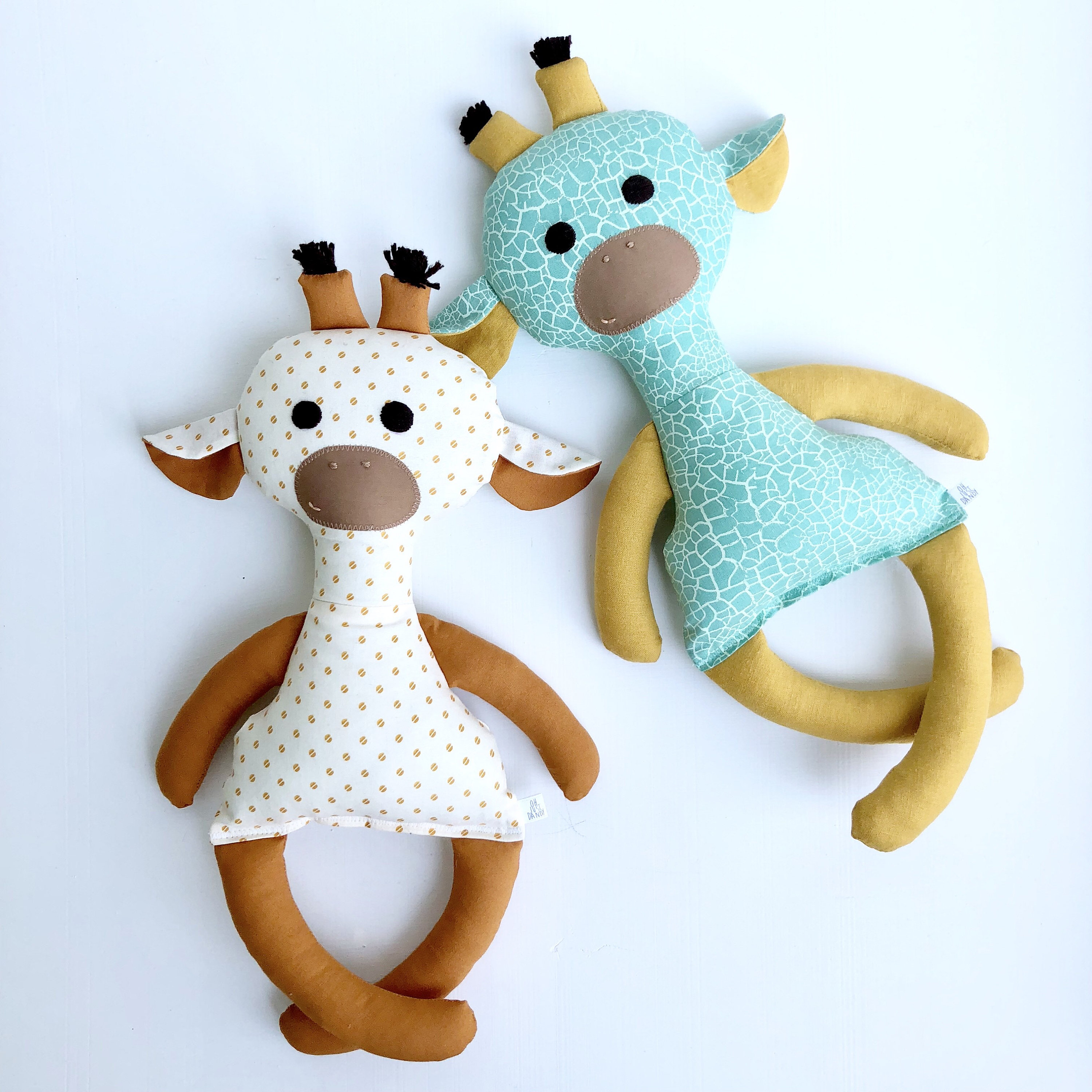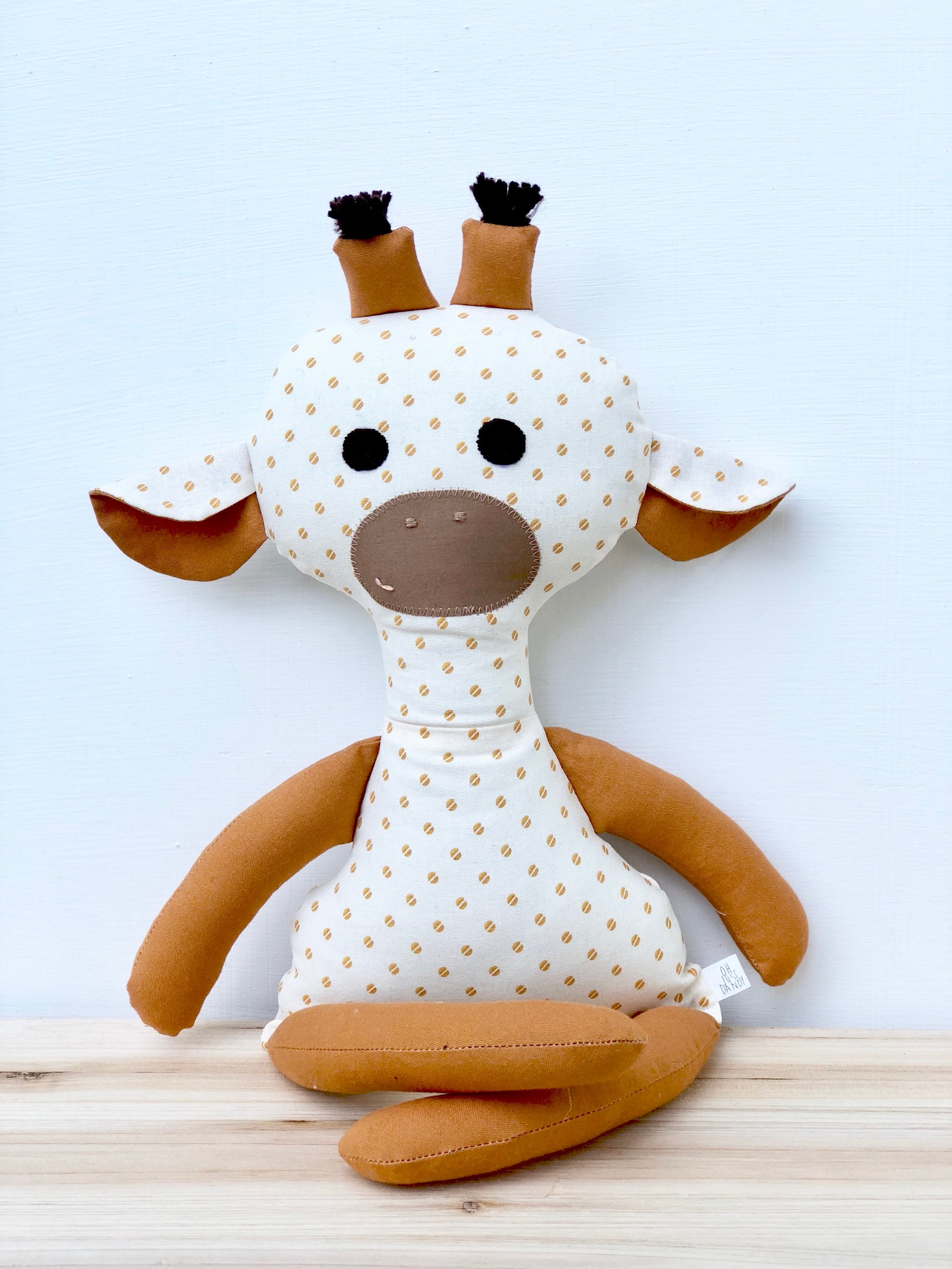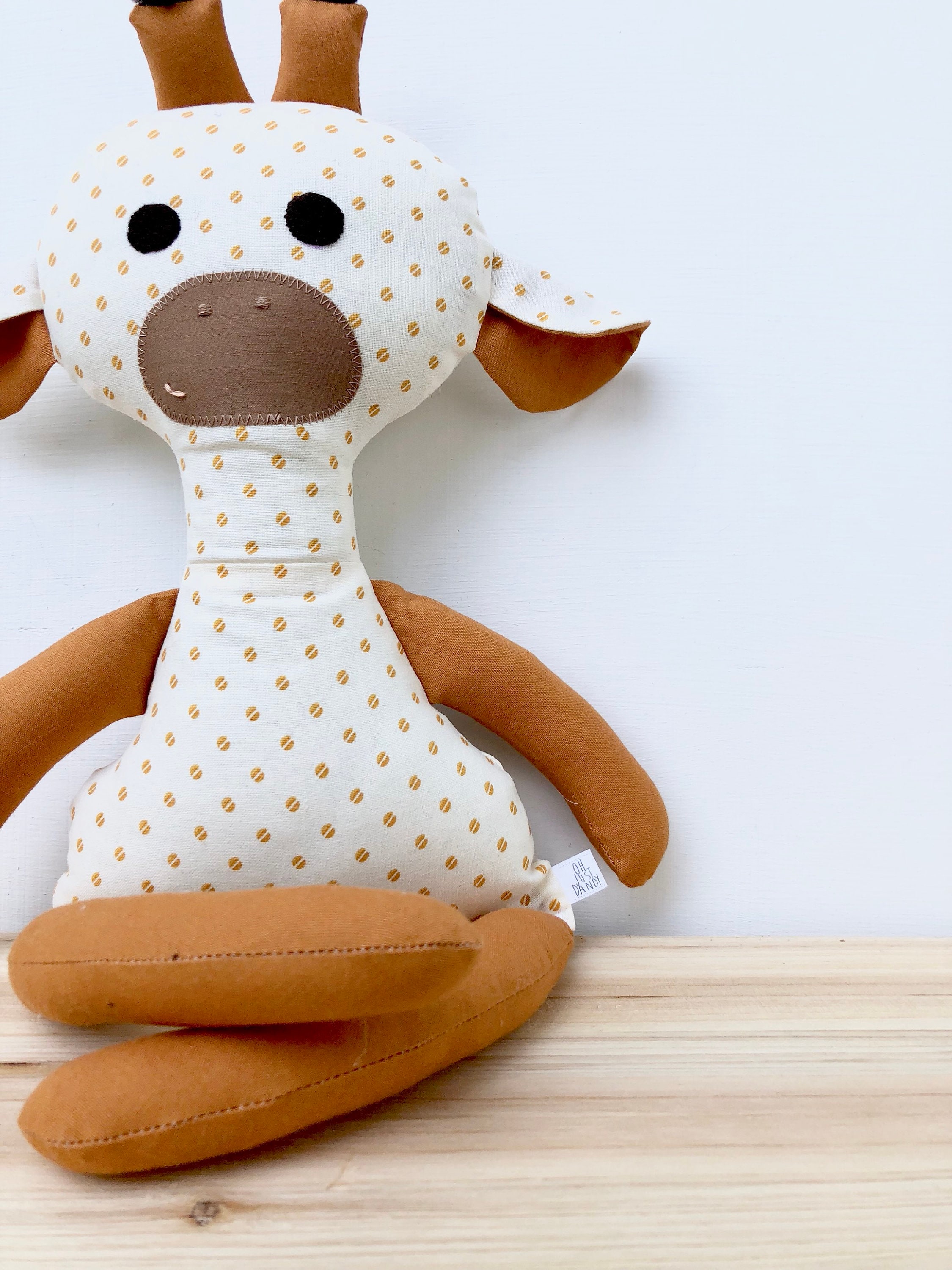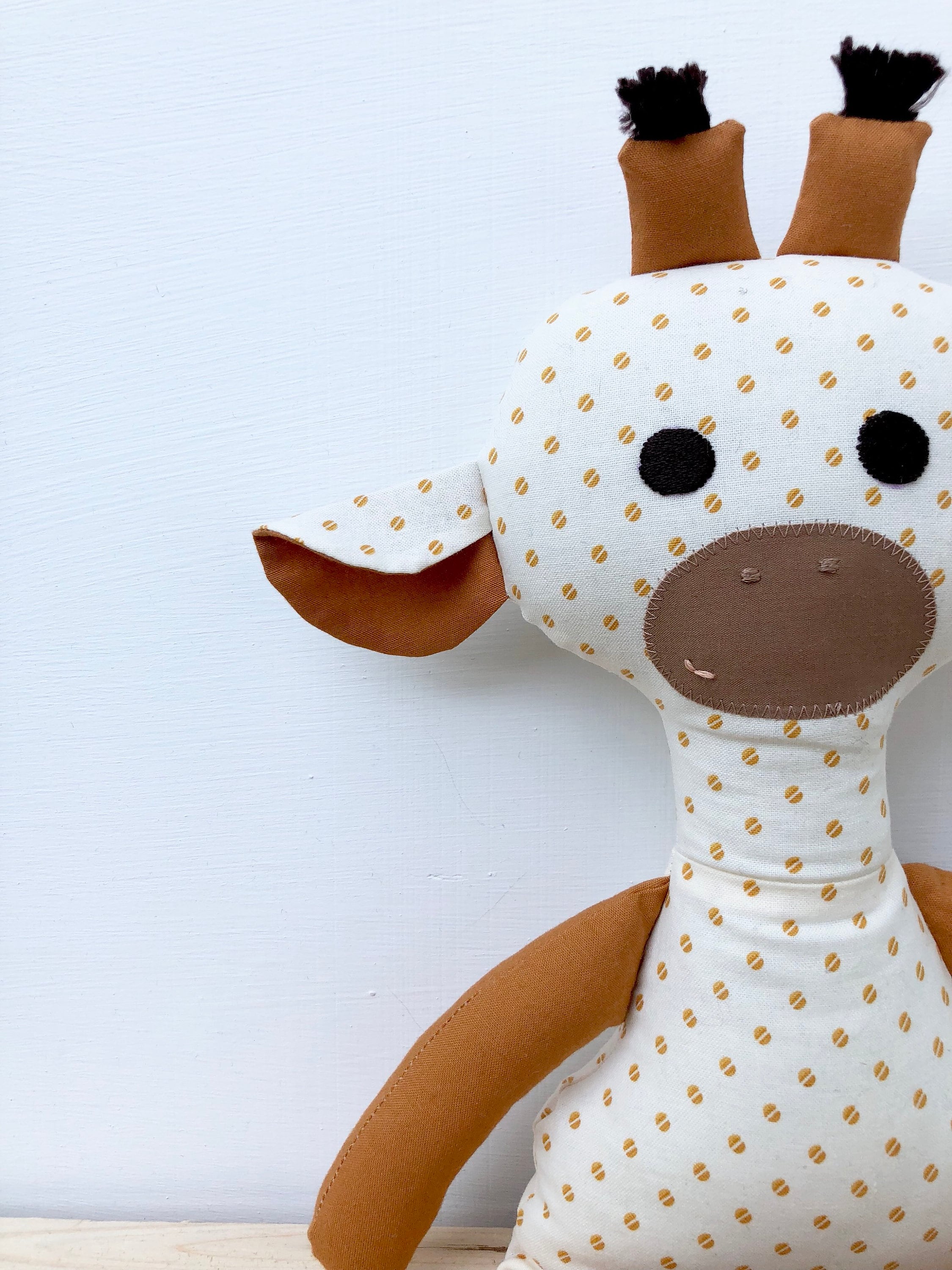 Is there anything cuter then a giraffe? This Giraffe is hand crafted for little hands. The sweet face is hand embroidered, making every one unique. I's the perfect play time and sleep time friend.
